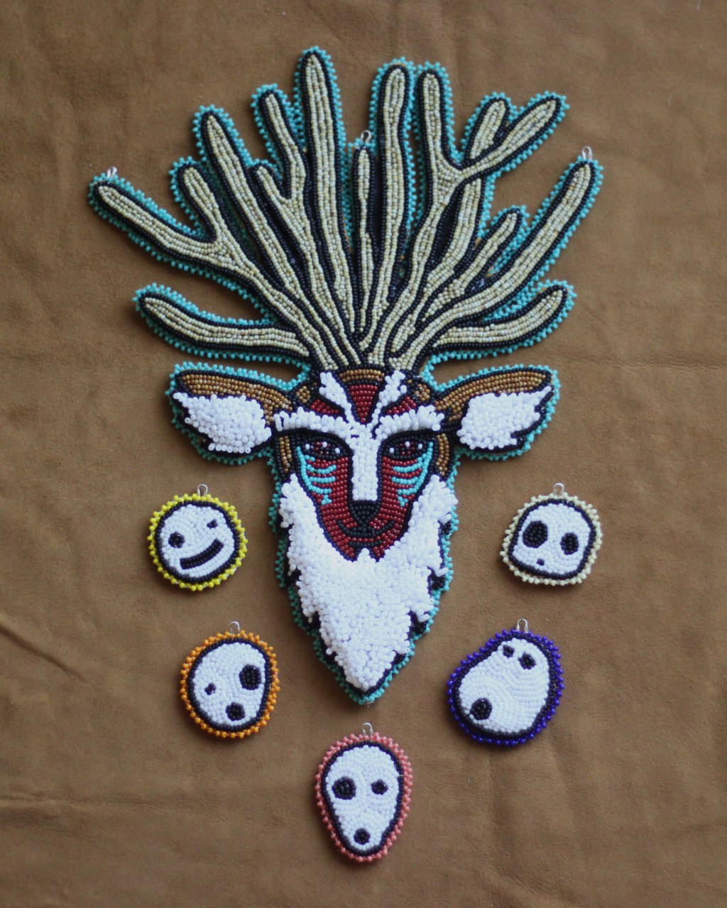 A beaded recreation of the god of the forest and his little friends from the classic 1997 film Princess Mononoke, directed by Hayao Miyazaki.
