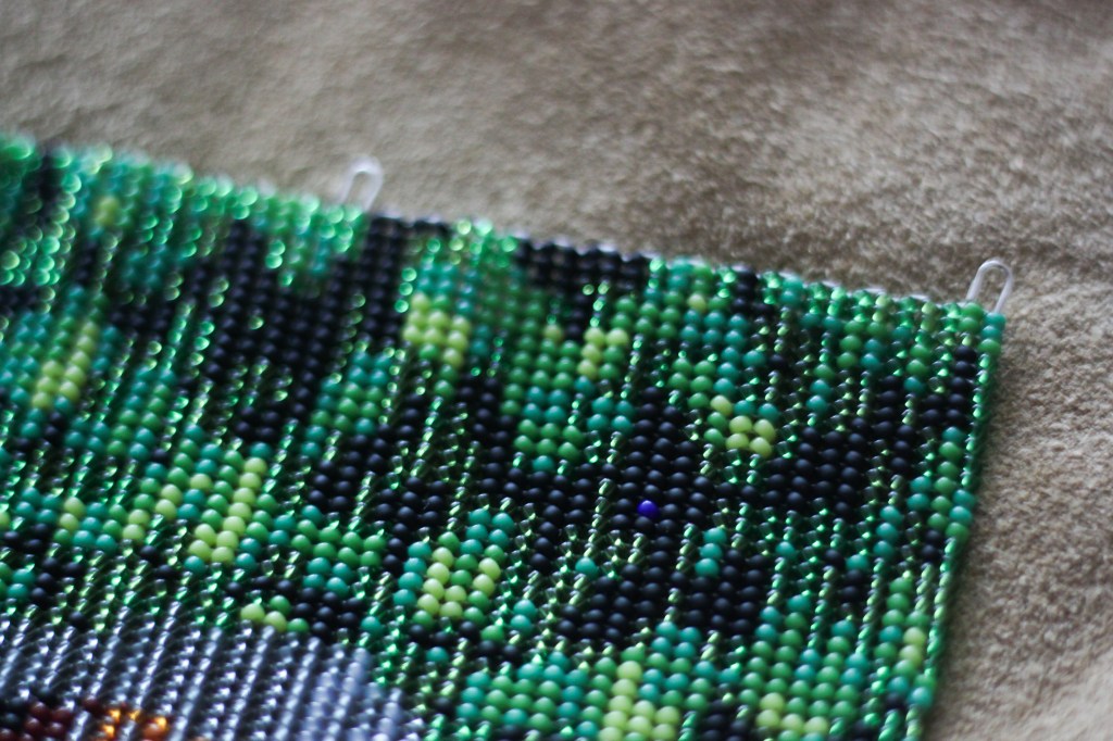 It is handwoven using ladder stitch and flat herringbone stitch. I used about 20 different shades of size 11 Miyuki beads to create this piece.