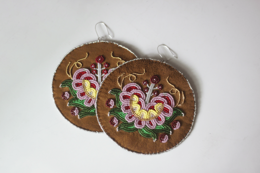 A large pair of statement earrings created to wear at Pride Winnipeg 2023. The pattern is a recreation of a floral design on a beaded wall hanging made over 100 years ago, currently stored in the Manitoba Museum archives.