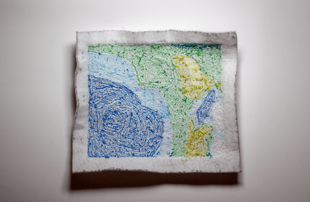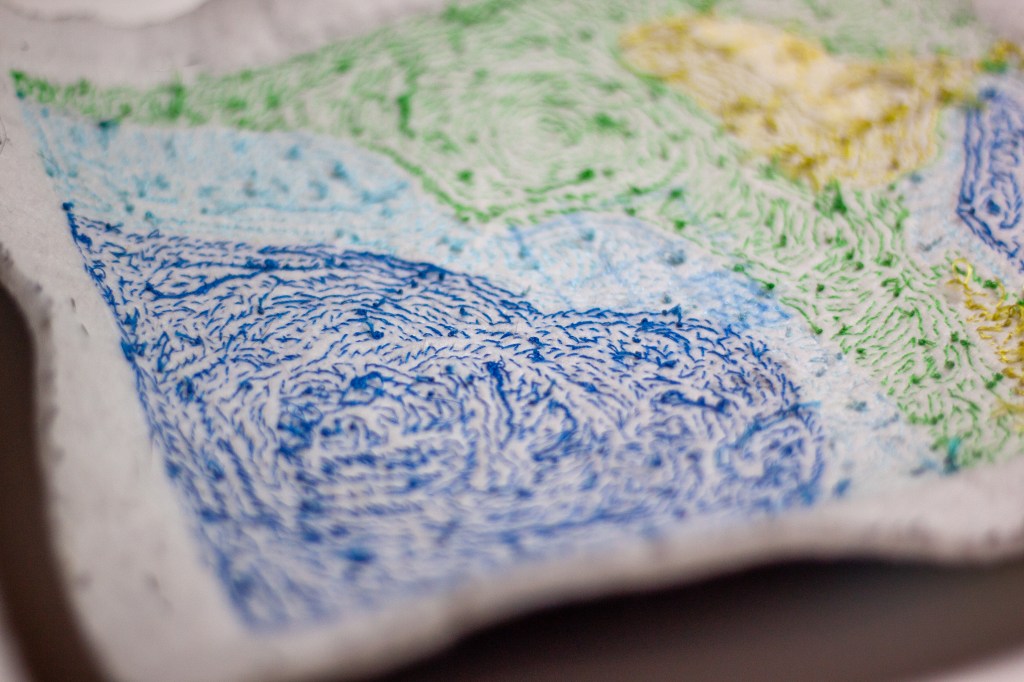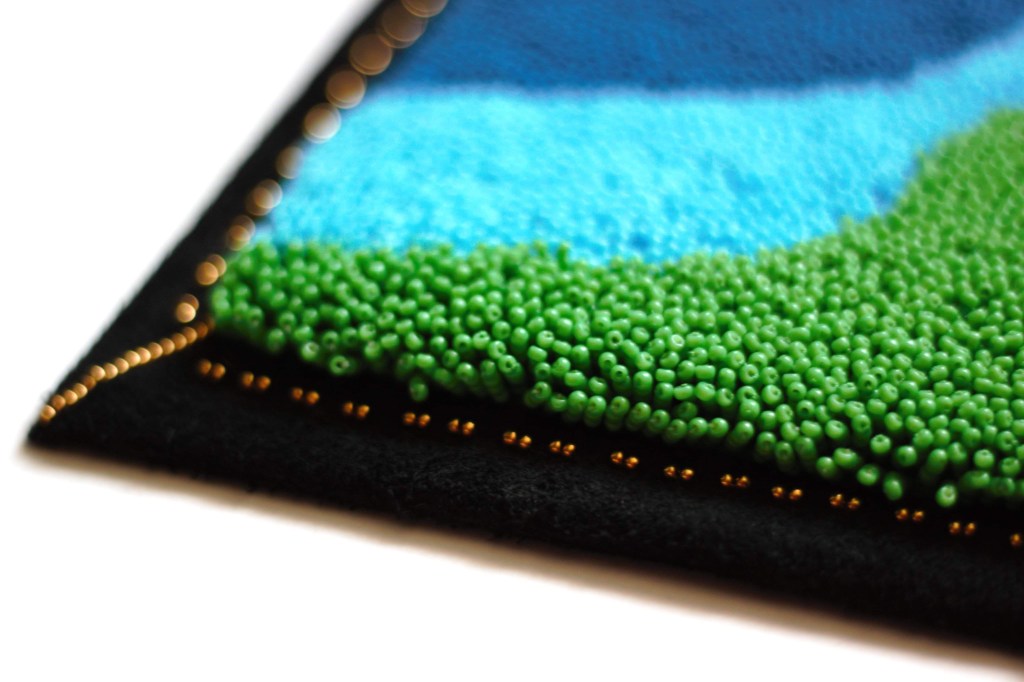 A beaded topographical map using a “bead tufting” technique, exploring one corner of the Métis homeland: the St. Laurent area.