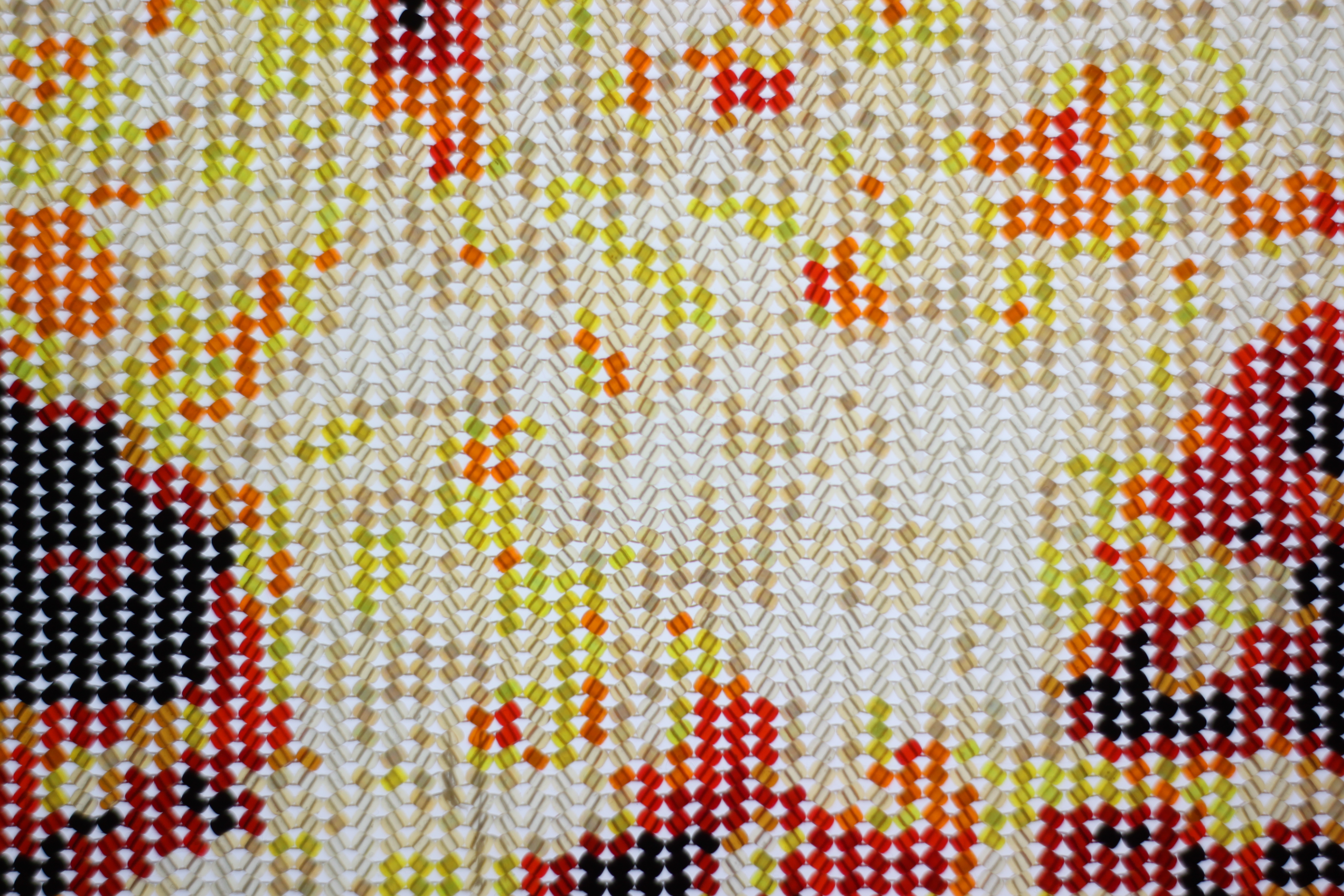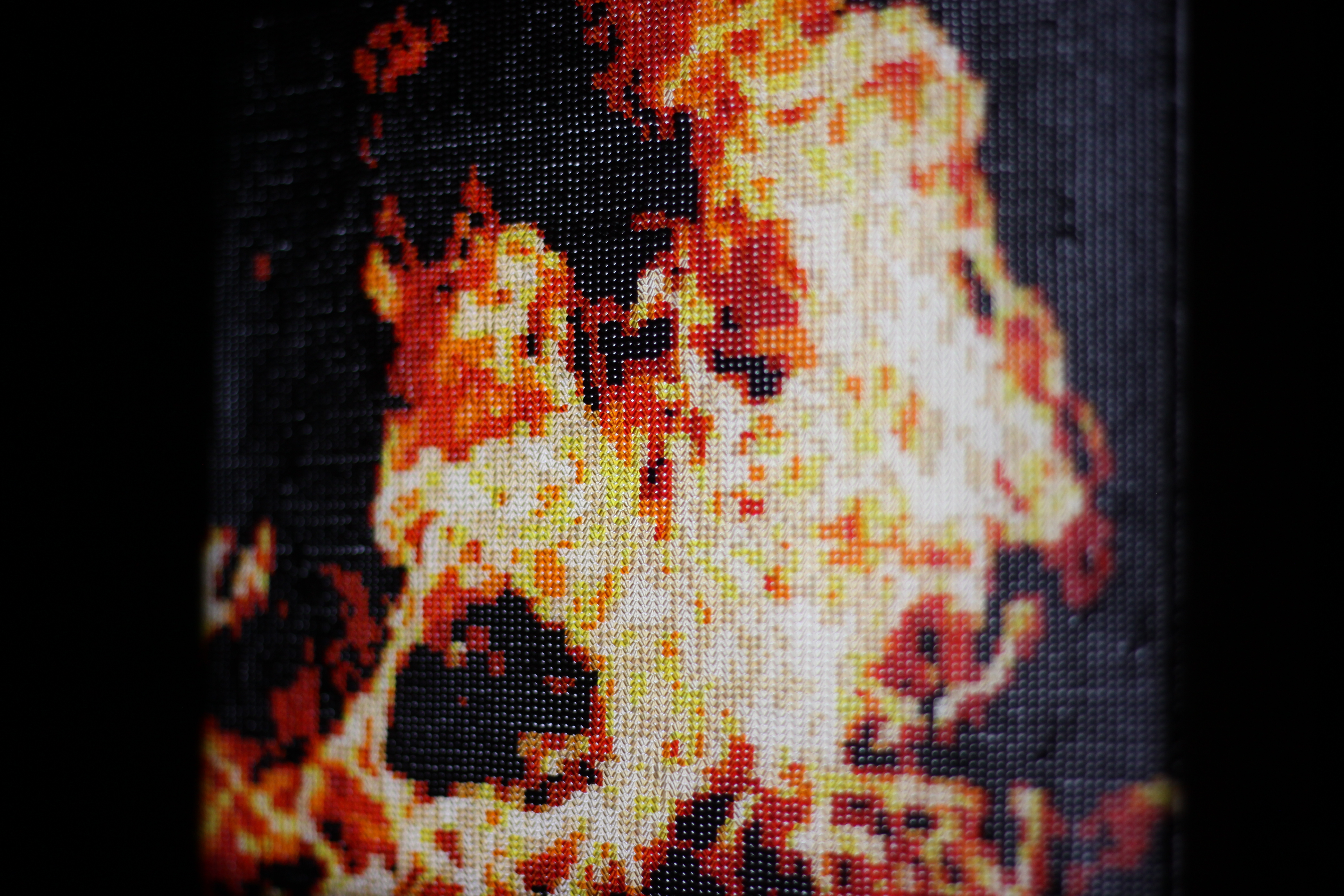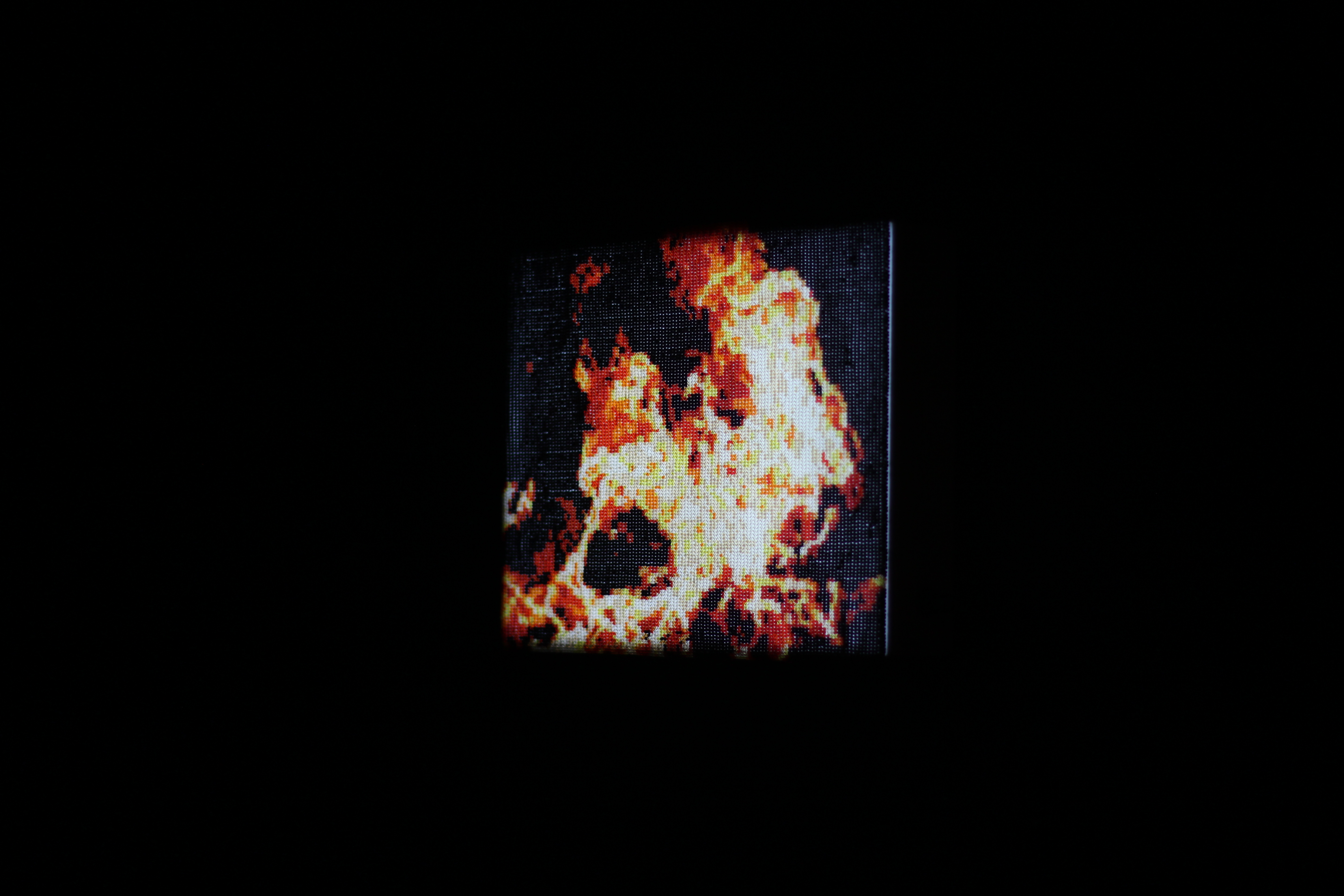 What you truly own can’t be lost to fire, 2025. Glass seed beads, thermally-fused/braided polyethylene thread on lightbox. 8 x 10 inches.